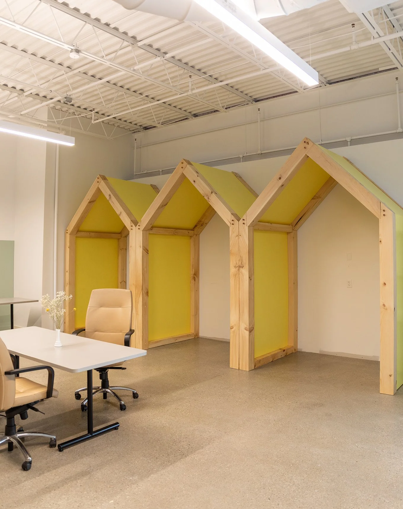Unique phME work booths (snug, house-shaped spaces inspired by the phME logo) for private or semi-private work